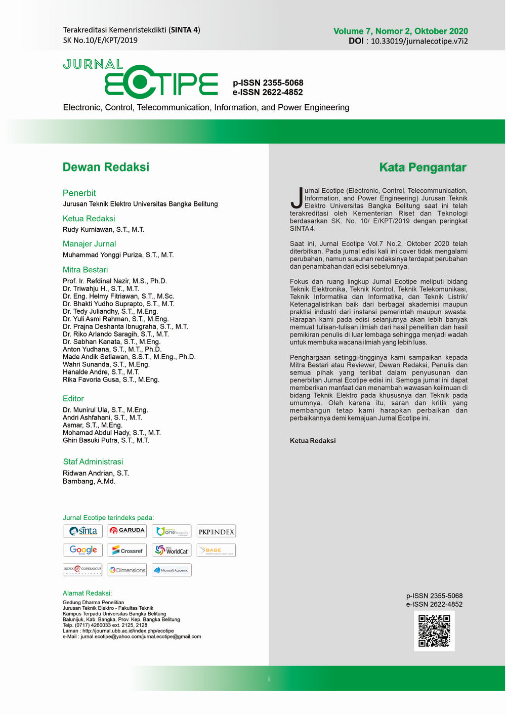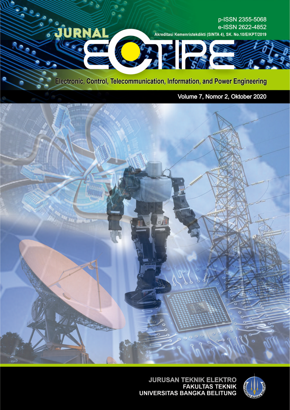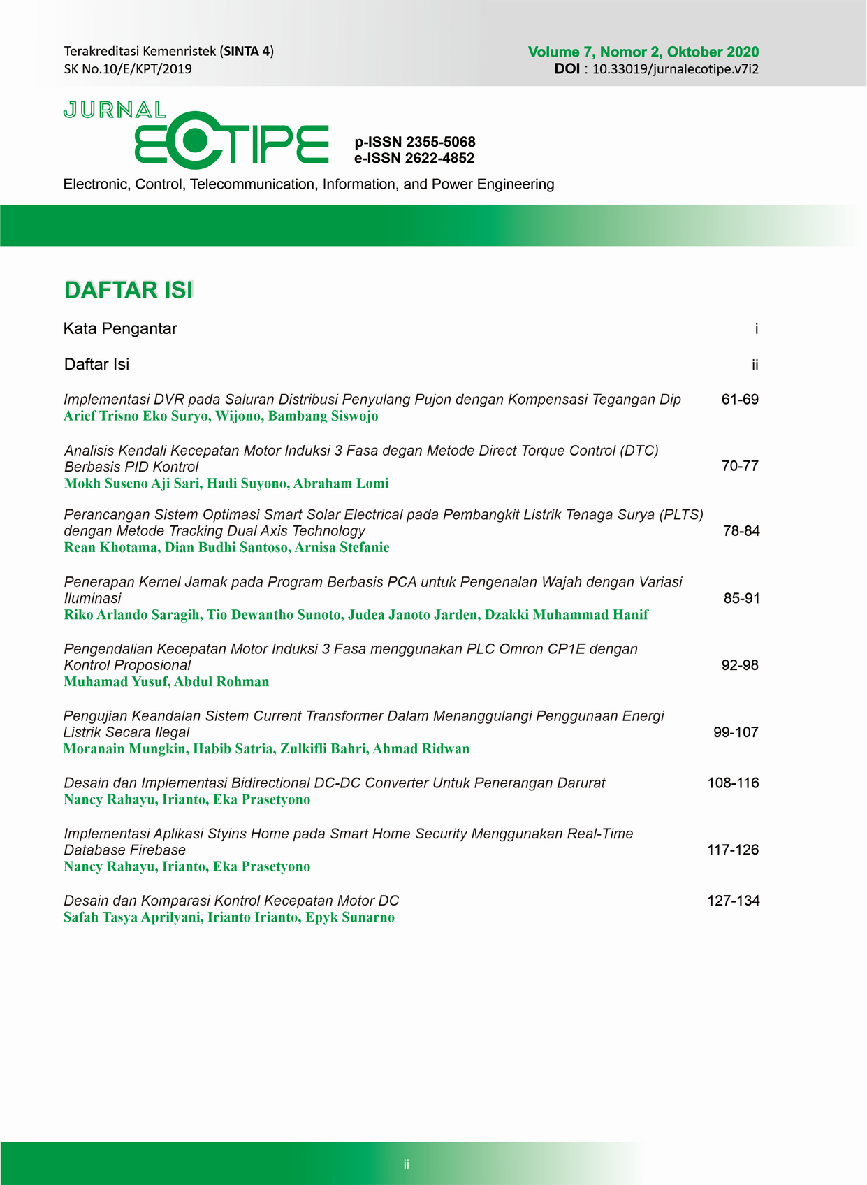Jurnal Ecotipe (Electronic, Control, Telecommunication, Information, and Power Engineering) Vol 7 No 2, Oktober 2020 starting from pages 61-126 containing 9 articles with knowledge in the field of Electrical Engineering covering the fields of Electronics, Control, Telecommunications, Information/Information Technology, and Power Engineering from several authors who come from inside the institution or from outside the institution.